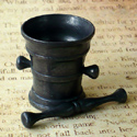 Dark grey mortar with a matching pestle, probably from pewter. Multiple grooved mortar with two(2) hands, decorative pestle.