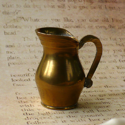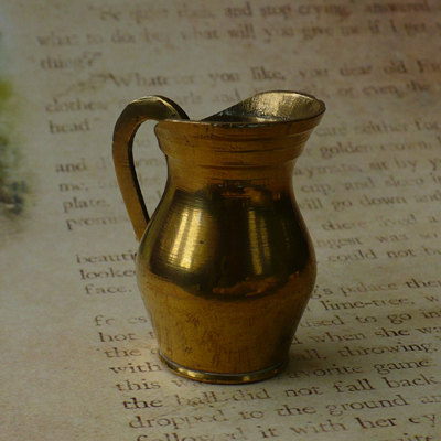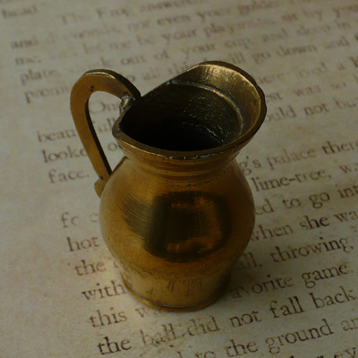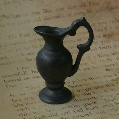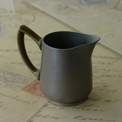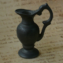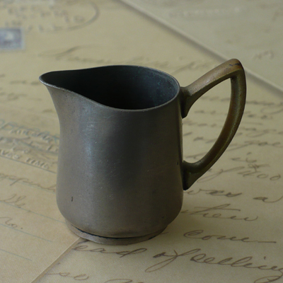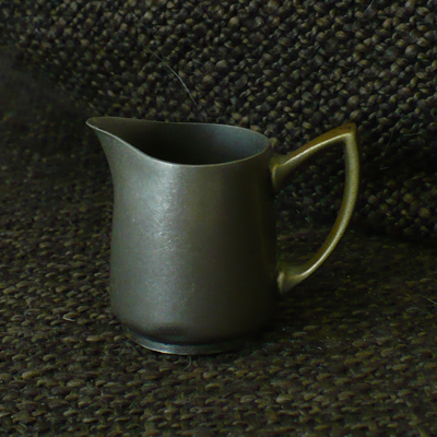 Small pitcher with decorative handle, in heavy die-cast metal. Can be used as water/milk pitcher or a vase.