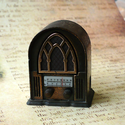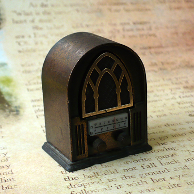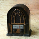 Cathedral style radio in retro look (it looks more Art Deco to me). Die-cast, tiny plastic FM channel display and fine details for a more realistic look.