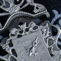 Unknown age, tin hallmark of an angel with a horn. Modeled by MiniFee (45cm MSD sized) and ChicLine (16" fashion doll).