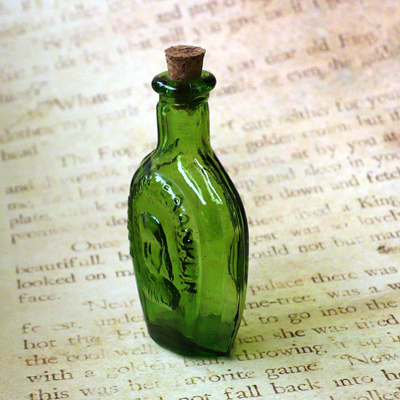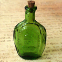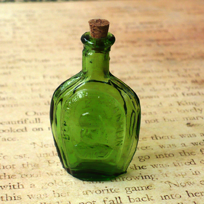 Decorative corked green glass bottle with a short thin neck. Flat oval design, front side has a shape of Benjamin Franklin and his name.
