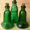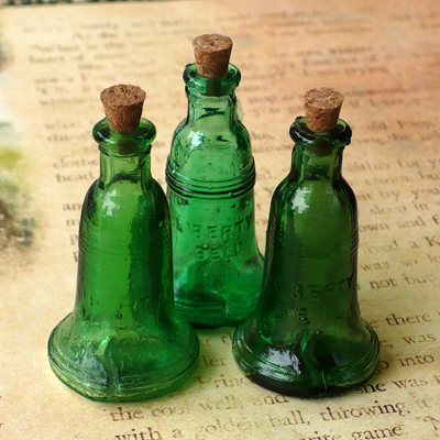 Decorative corked green glass bottle in a shape of a bell. There's a rim around the upper side of the bottle and front side has a