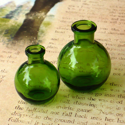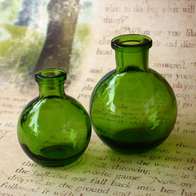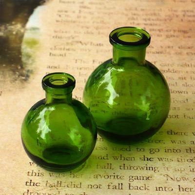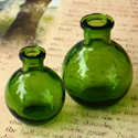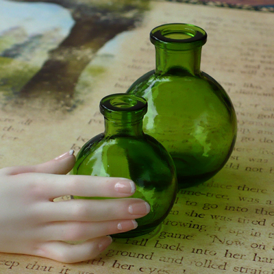 A set of two matching round decorative glass bottles in light-green shade. Very stylish and can be used in a diverse doll settings,
