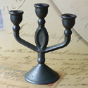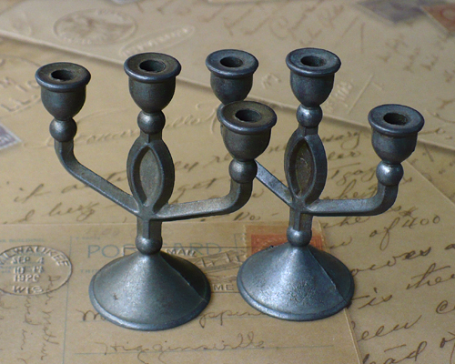 A pair of matching candelabra, metal with matte finish. Each candelabrum has three(3) long branches. Age is unknown, no stamps or hallmarks.