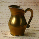 Brass shiny pitcher with a wide spout and soldered handle. Uneven surface inside the pitcher. Can be used as water/milk pitcher or a vase.