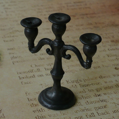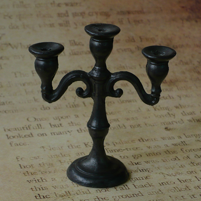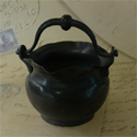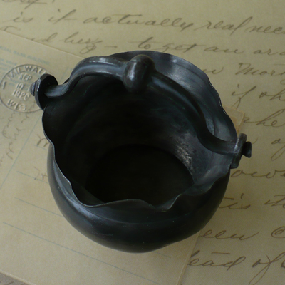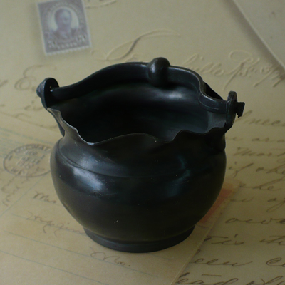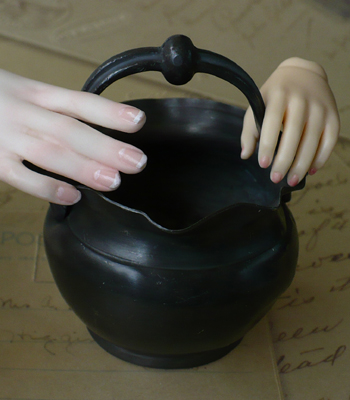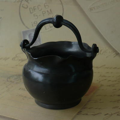 Dark grey (almost black) cauldron with a large scalloped rim and decorative handle. Very useful for witchy and alchemy dolls and dioramas.