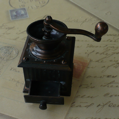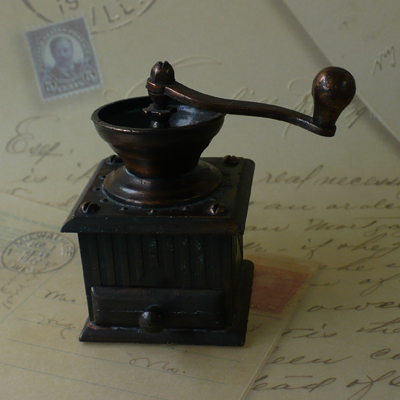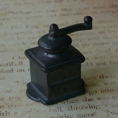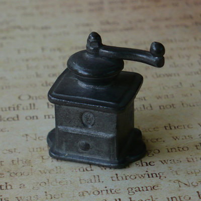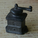 Small solid die-cast coffee grinder. Very heavy tin piece in light-medium grey, non functional.