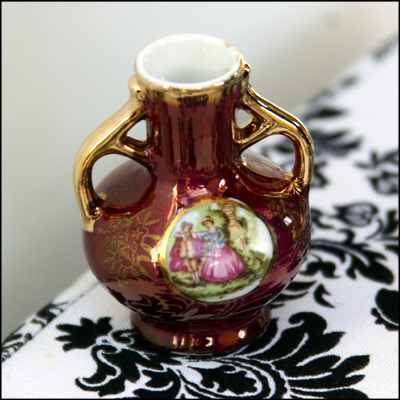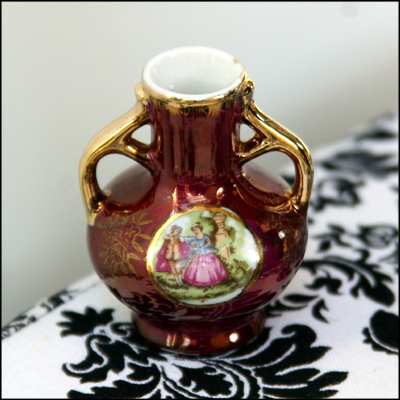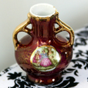 one side features a court couple. There are a few white spots in the paint that were originally present on the vase. Age is unknown, no stamps or hallmarks.