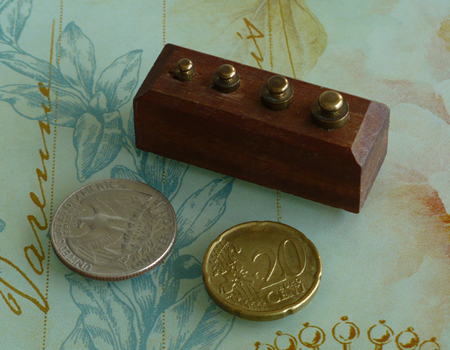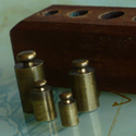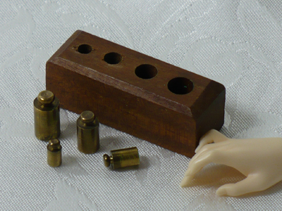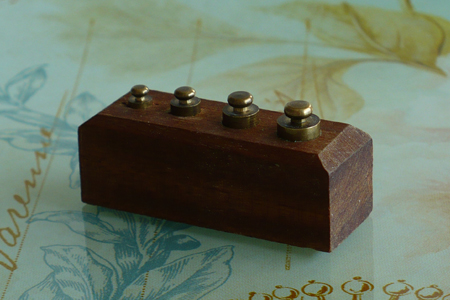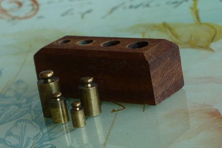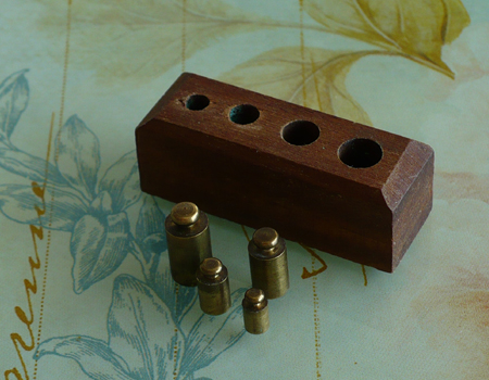 Calibration scale set of 4 solid brass weights in different sizes. Complete in small wooden storage block. Biggest weight is 4