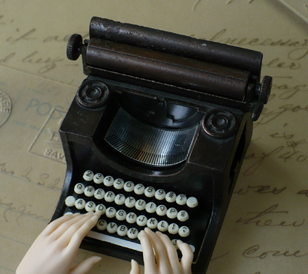 The keywriter is of course not functional. Age is unknown, made in Spain vintage pencil sharpener. Modeled by ChicLine (16" fahion doll).