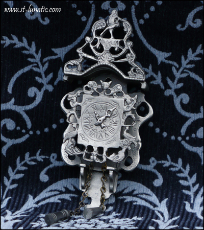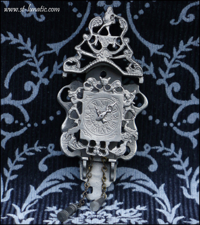 Miniature antique Comtoise wall clock. Solid pewter with extraordinary details, surface pictures animals and people in