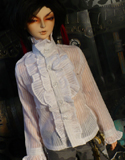 Semi transparent muslin cotton striped blouse, with ruffle trim on the collar and sleeves, and double ruffles in front.