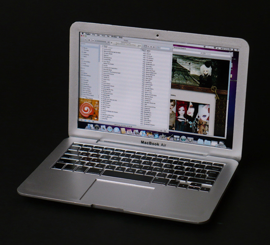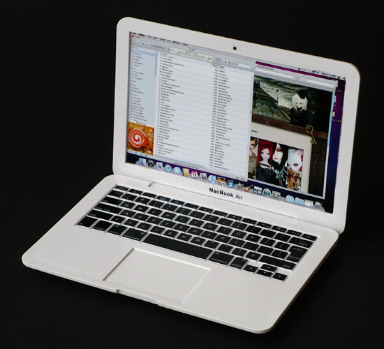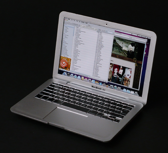 Small version of the Apple MacBook Air. Flat and to the tiny details recreated to look like the real thing. Black keys have their tiny functions printed