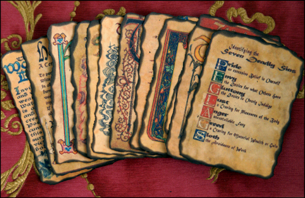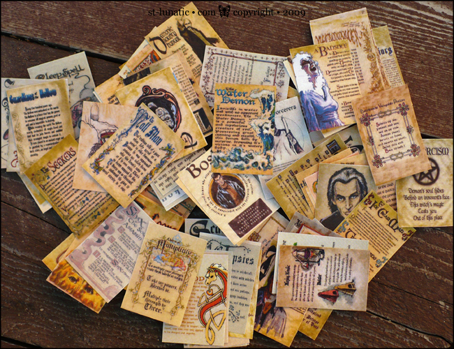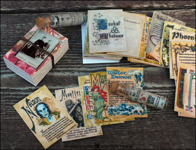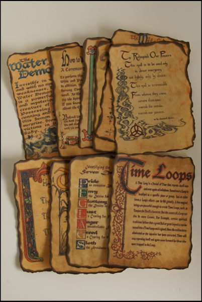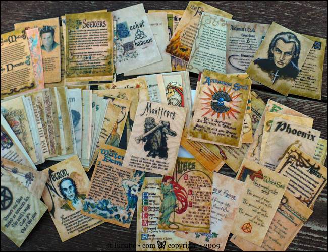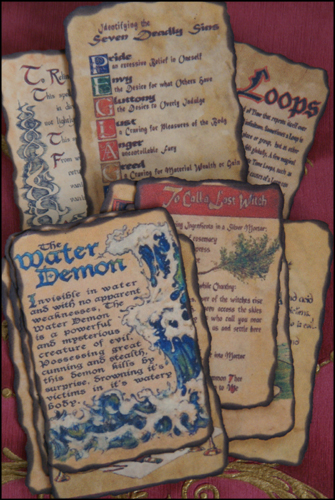 Loose pages from Book Of Shadows. High quality written in calligraphy readable text and images, with edges altered by hand to look old.