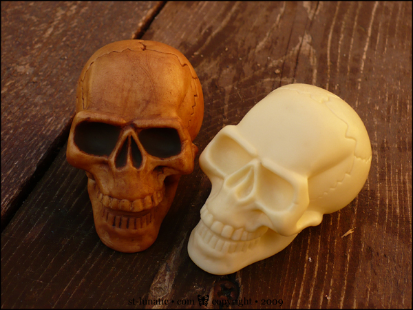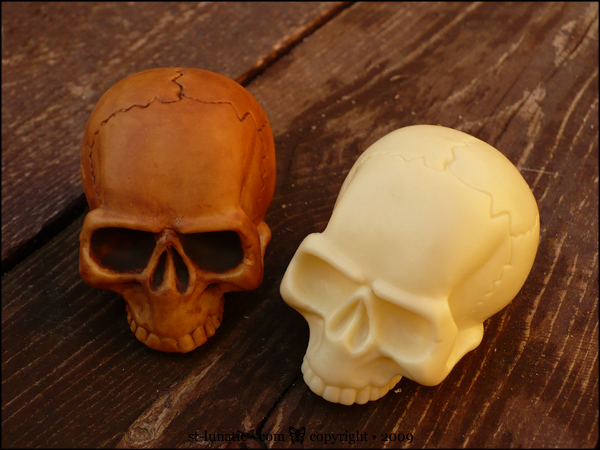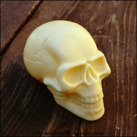 Small doll scaled skull, unpainted in off-white (to yellowish) tone. With a removable lower jaw for more possibilities