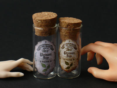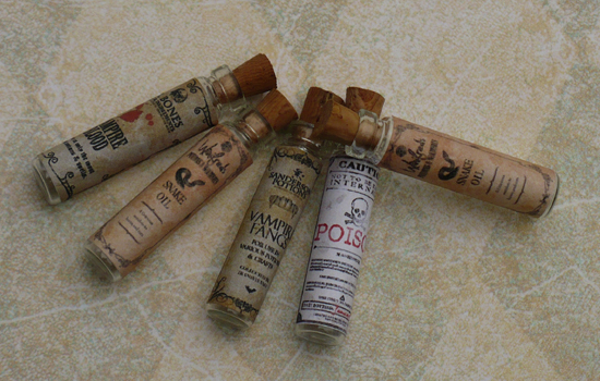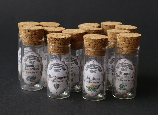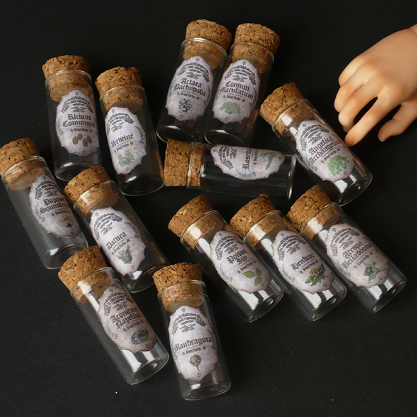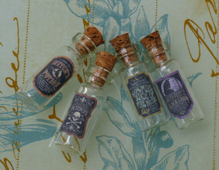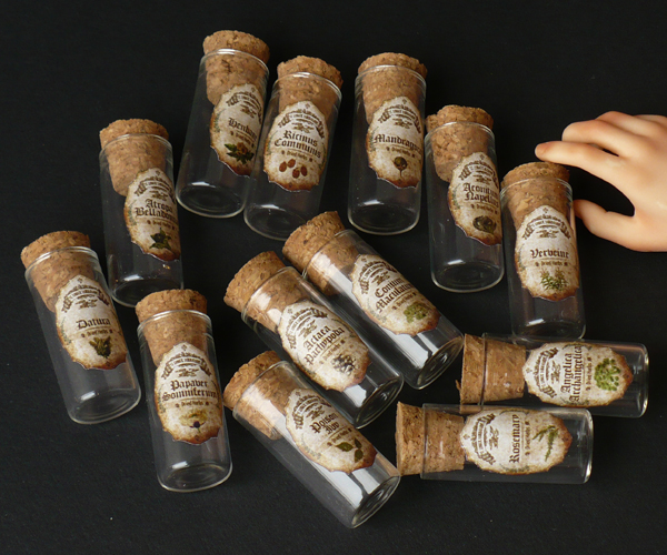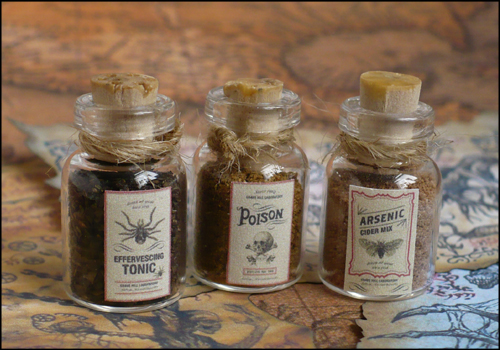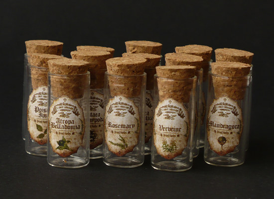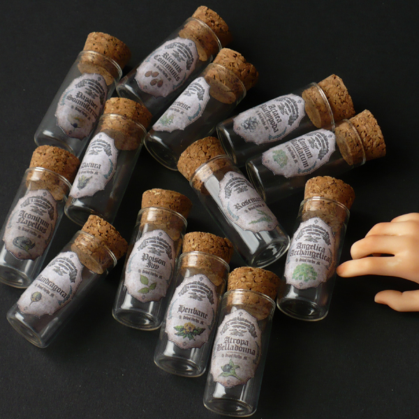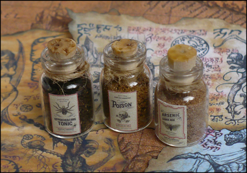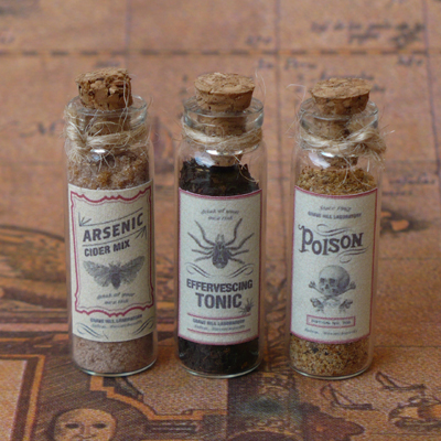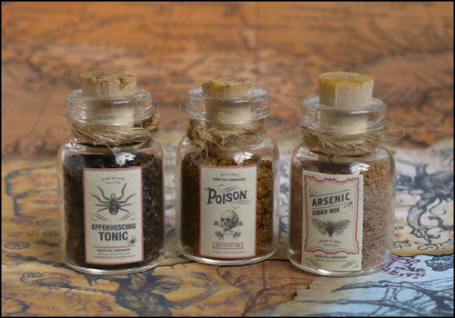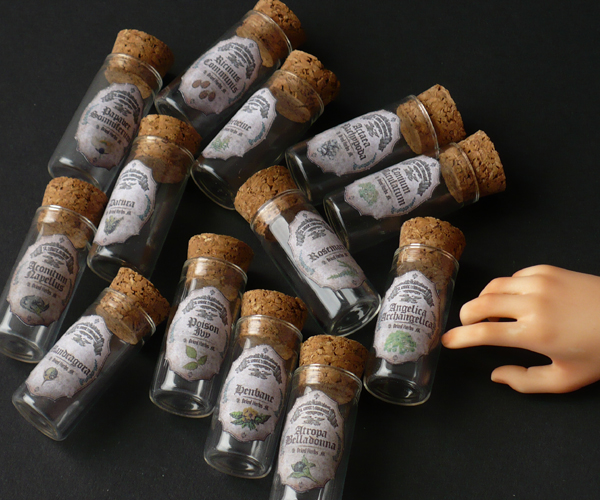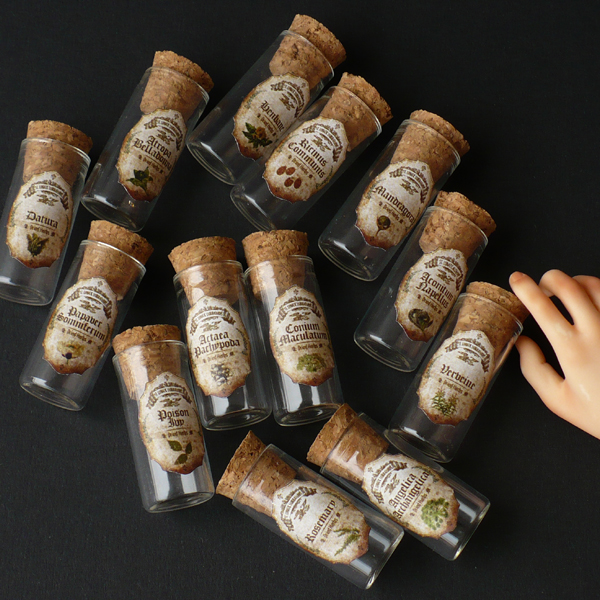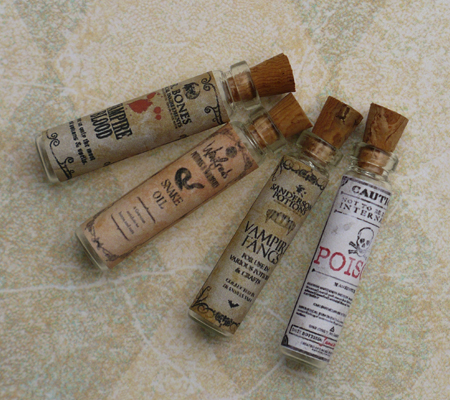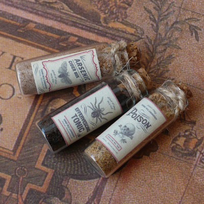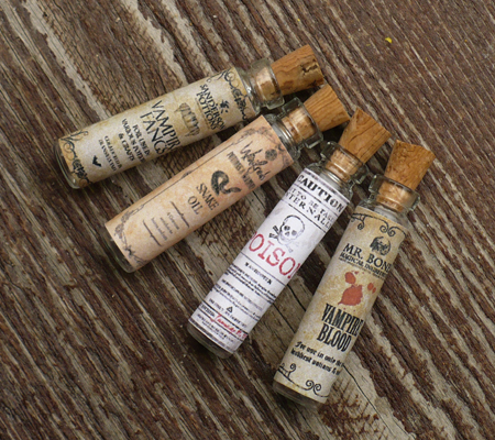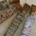 Long thin corked vials with large antique styled poisonous drink labels. With natural fiber cords around the neck. Filling can