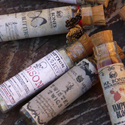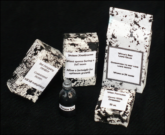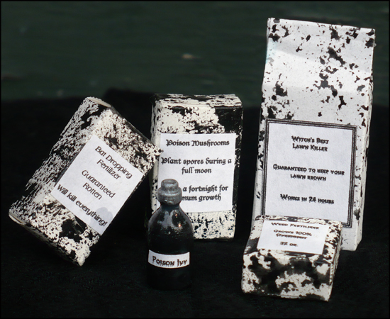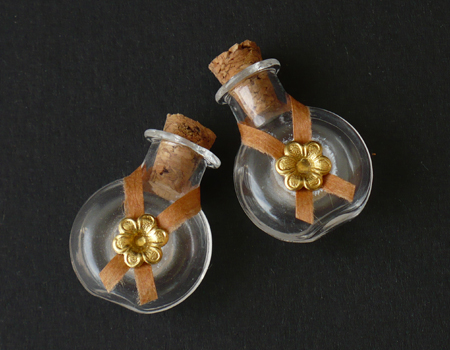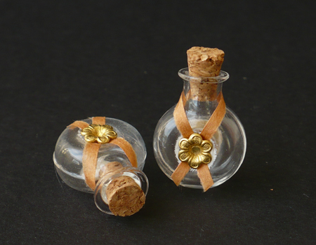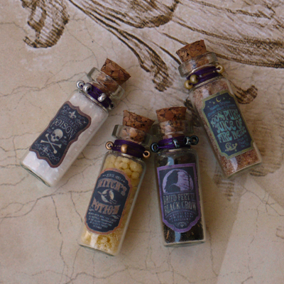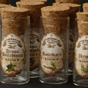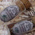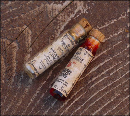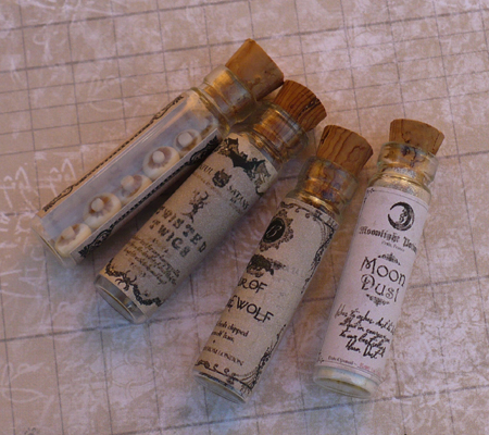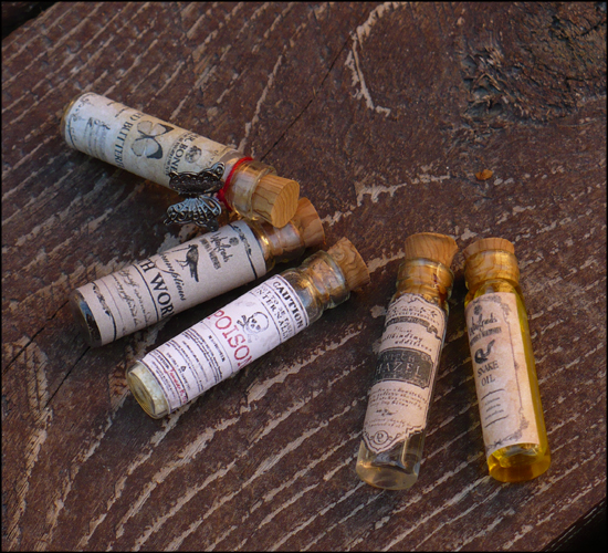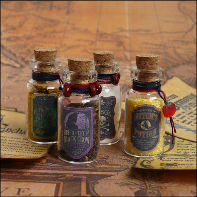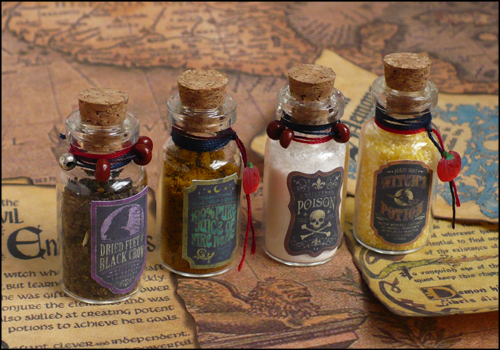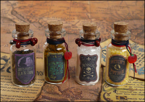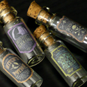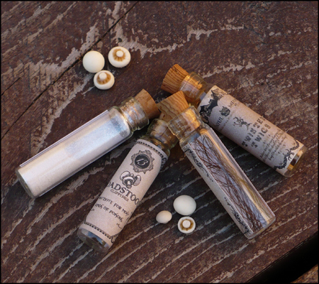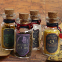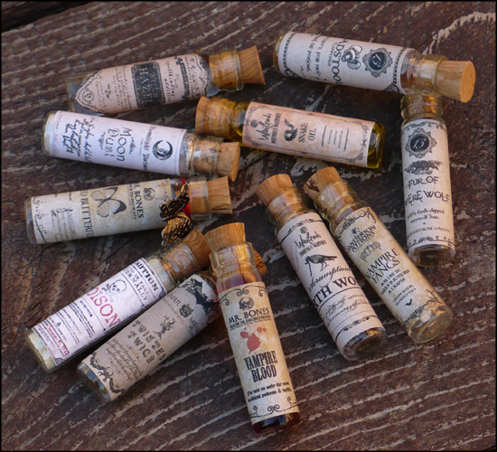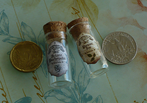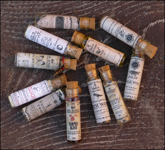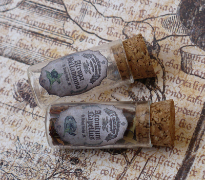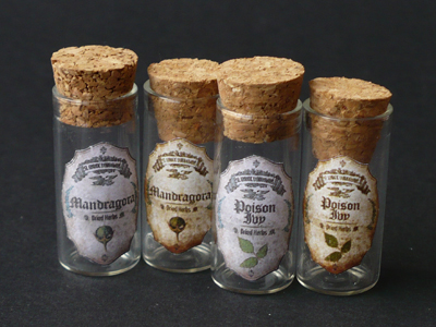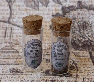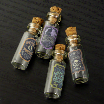 Long thin corked vials with large antique styled poisonous drink labels. With natural fiber cords around the neck. Filling can