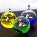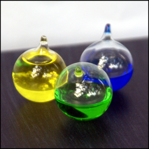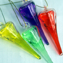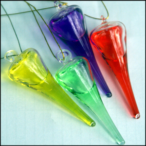 Cone shaped glass vials with a loop on top (for hanging the vial or attachment of a tag), filled with colored liquid.