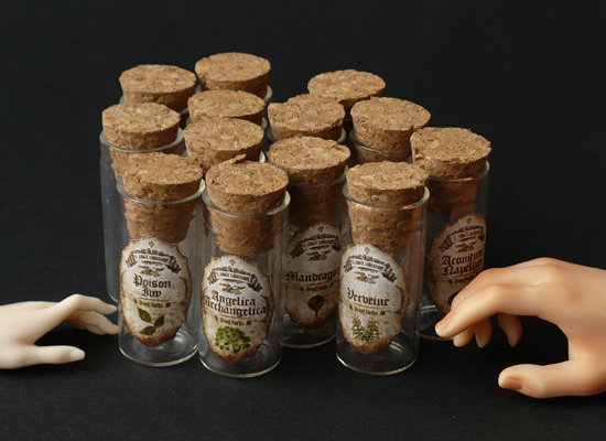 Vials come empty and can be used for different kinds of potions, ingredients or any other purpose. Modeled with a CP Delf hand (20") and CP ChicLine (16").