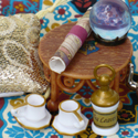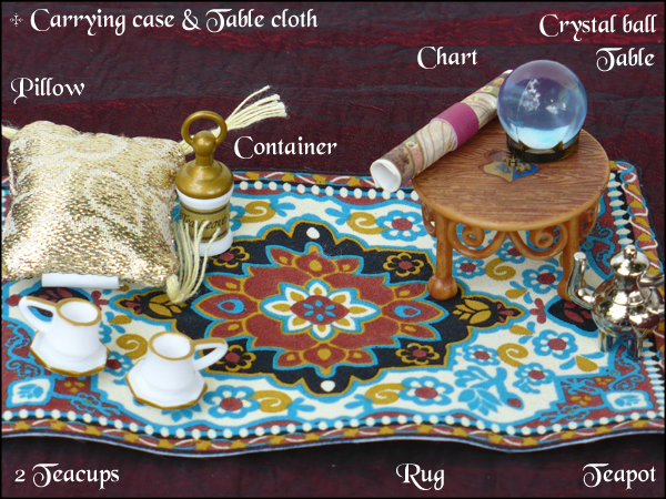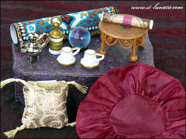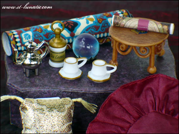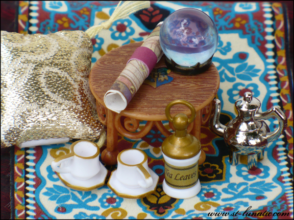 Miniature Harry Potter replica divination class set. Includes metal teapot, star chart, table, gold pillow, carpet,