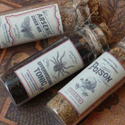 Tall corked glass jars with wide neck, for dry herbs storage. Each vial has a gray label in a vintage look with herbs