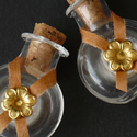 Tiny corked flat and round glass potion vial. Decorated with a brown kraft paper ribbon and tiny brass flower on both sides of the vial.