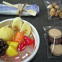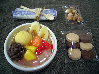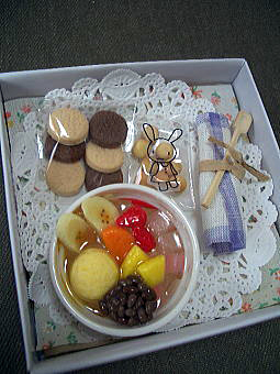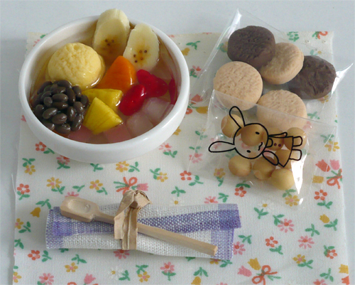 Small one of a kind desert or brunch set includes a bowl with ice cream and different fruits (hardened in clear resin, can be taken out), napkin, wooden spoon & two bags of cookies.