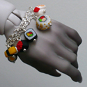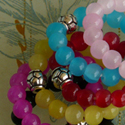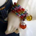 Four stranded wrap bracelet with a mix of red, orange, yellow, green, blue, pink and white seed beads, and large glass dangles at the both ends.