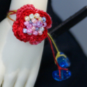 Hand crochet 2 tier red-pink flower on a thin two-toned cord. The flower is decorated with pearly pastel seed beads, and cord ends with cobalt blue glass.