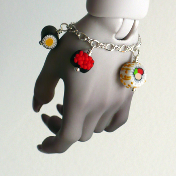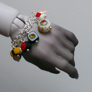 Sterling silver plated doll bracelet with four(4) handmade by artisan tiny sushi on silver plated charms. These are soooo ultra kawaii and look absolutely delicious!