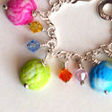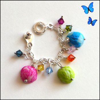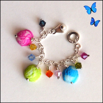 Sterling silver plated bracelet with three handmade polymer clay frozen yogurt charms, and seven multicolored 4mm Swarovski crystals.