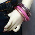 A set of three matching Sakura bangles: two lucite bracelets in soft pink accents and one metal with a row of glass seed beads. Modeled by Unoa Quluts.