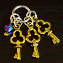 Petite two-toned key ring with 3 tiny gold decorative skeleton keys, and a blue-purple iridescent faceted glass dangle. Unlock small curiosity boxes