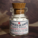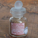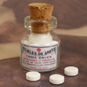 Fat glass bottle with a French vintage styled label 'Pilules de Sante' ('pills for good health' I believe).
