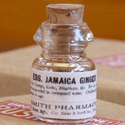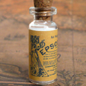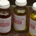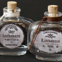 This laudanum is bottled in a corked glass oval vial with a silk cord around the neck.