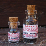 One of the most infamous poisons, and dark mind's favorite tool. Two different sized bottles with an antique label for deadly arsenic with a short description for antidote.