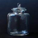 Square glass apothecary jar with a wide neck and loosely fitting top shaped lid. Handblown and elegantly thin glass.