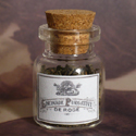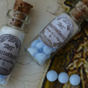 Thin long corked glass vial with the 'purple wonder pill' Hyacinthum. Pocket/bag sized vial contains 25 shiny light lila pills (made of glass)