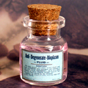 Glass bottle with the 'purple wonder pill' Hyacinthum. Bottle contains 50 shiny light lila pills (made of glass) with a ball of cotton on top to prevent breakage. Label is both