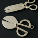 A pair of metal scissors, one in round design and a longer thinner shears. Smooth electroplated finish. Functional but not sharpened to cut.