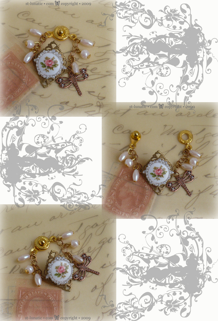 Old fashioned dreamy bracelet with a filigree 'shield', delicate vintage glass rose cabochon, dragonfly and pearl charms.