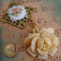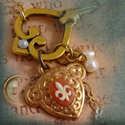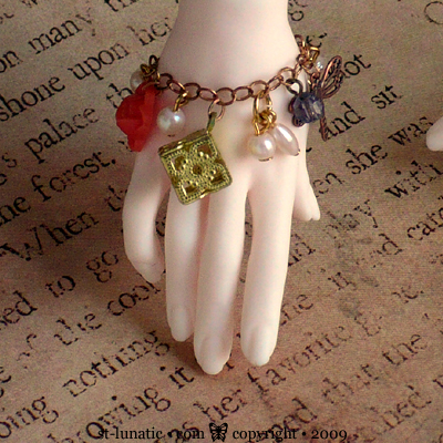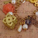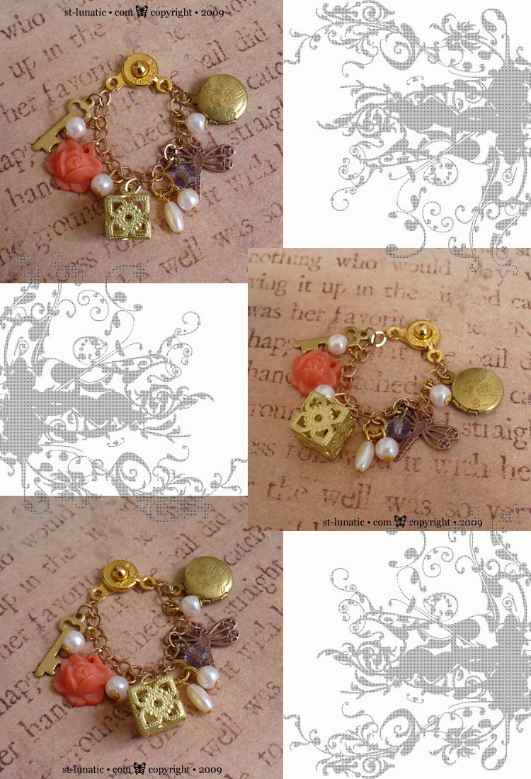 Dreamy charm bracelet with a (doll)handful of dangles like a vintage key, floral locket, resin flower cab, copper dragonfly, filigree cage box and pearls. Please note, I ran out of