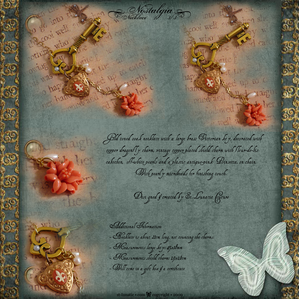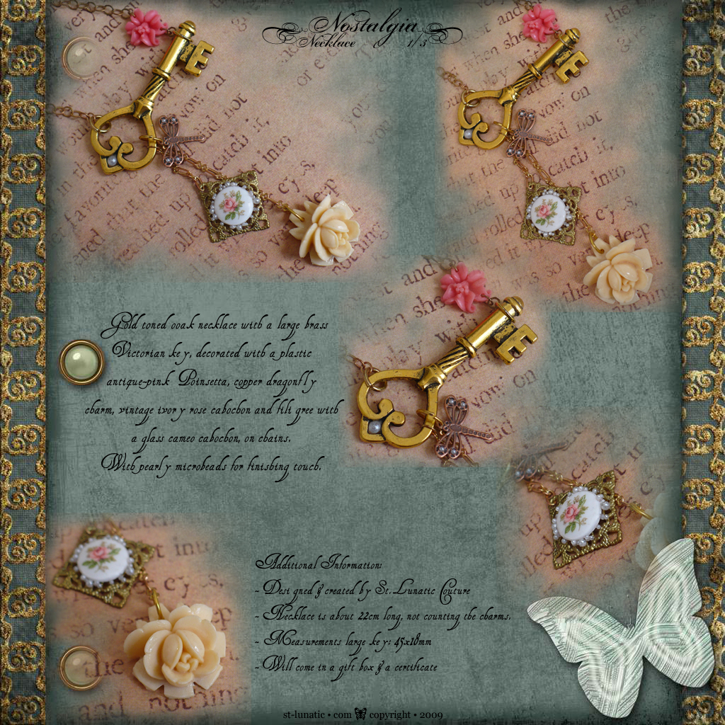 Gold toned necklace with a large brass Victorian skeleton key as the center piece, decorated with among other Poinsettia, copper dragonfly, ivory rose cabochon and pearly microbeads.