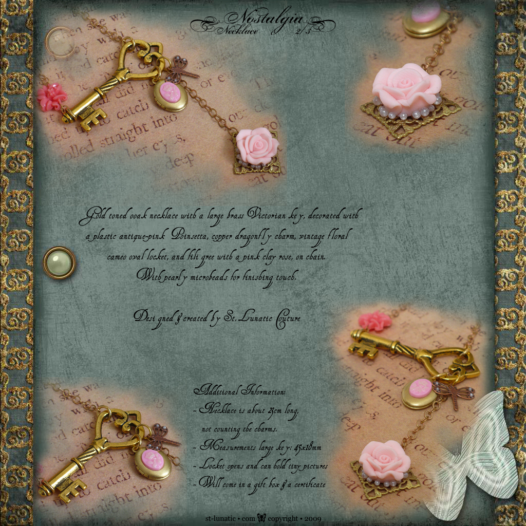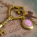 Second version of French Garden necklace, with a large brass Victorian skeleton key as the center piece, decorated with among other Poinsettia, oval cameo locket,