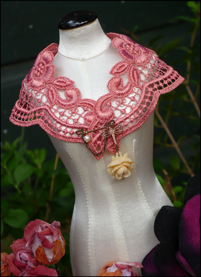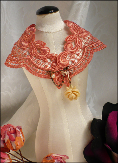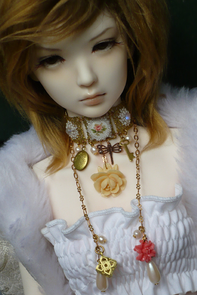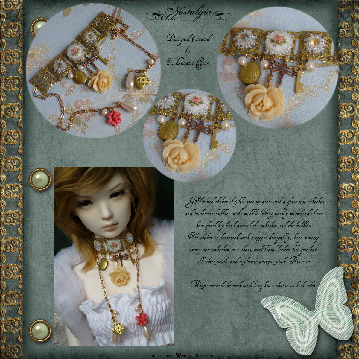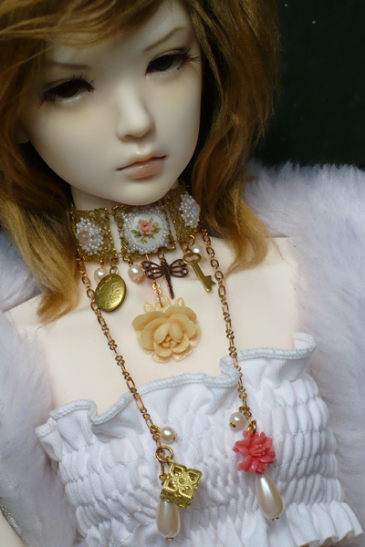 ivory rose, brass locket, poinsettia etc. The choker wraps around the neck with long chains. Modeled by Supia.