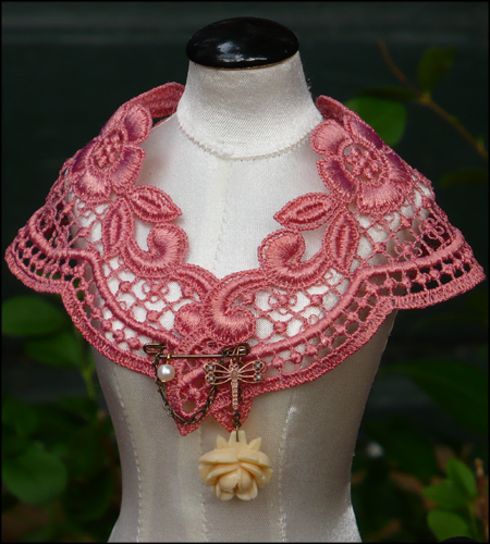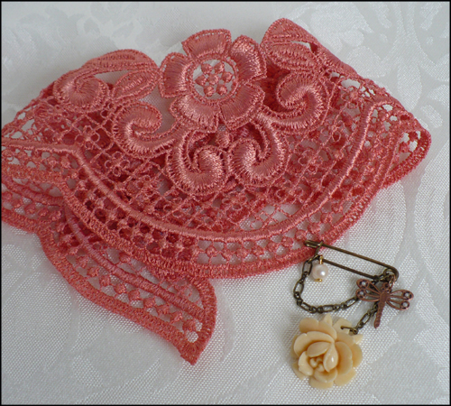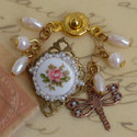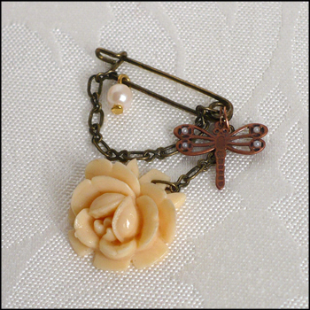 Comes with a small old fashioned bronze pin, decorated with a thin chain, large ivory rose, copper dragonfly and a pearl.