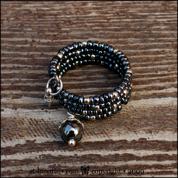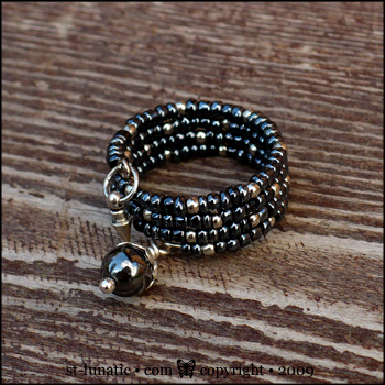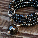 Stylish during day, rocking during night. Coil bracelet with four strands of metallic black seed beads and metal beads. One end has a tiny metal spike hanging,