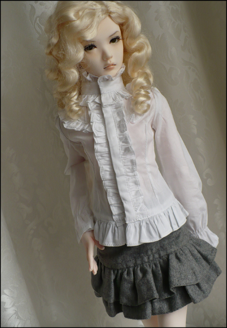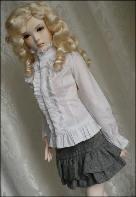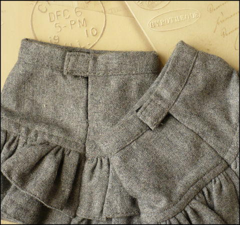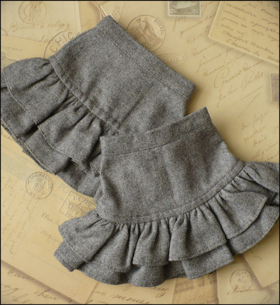 Mini skirt in gray wool, with large ruffles. Timeless design suitable modern & trendy outfits as well as casual or for vintage look. Modeled by Supia.